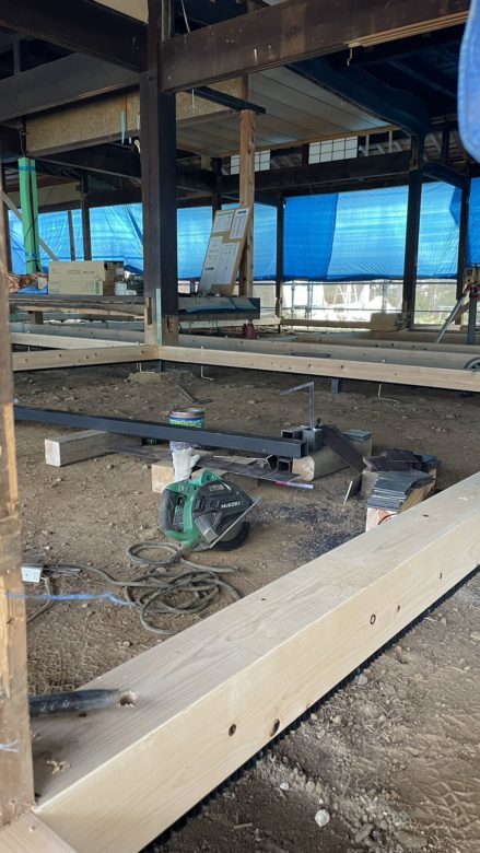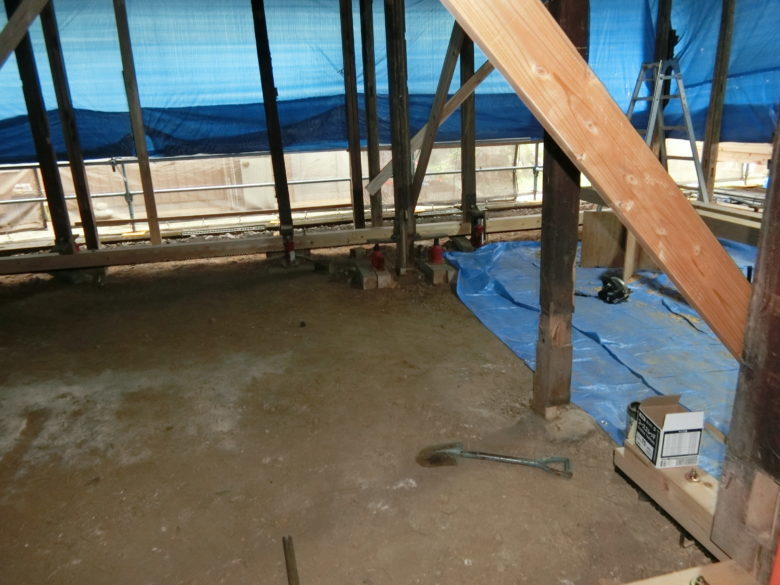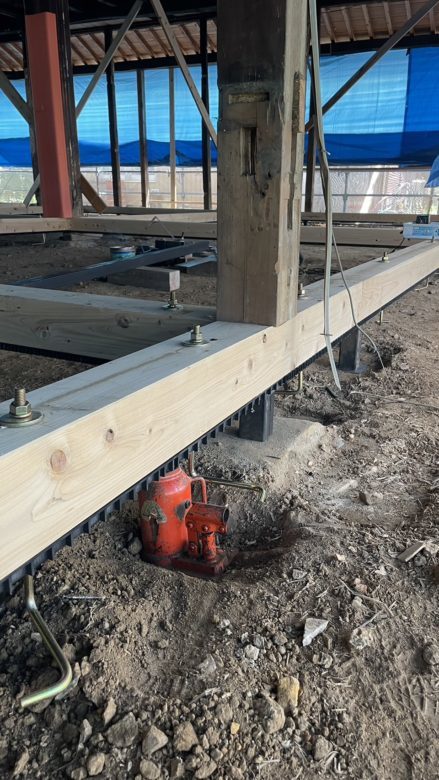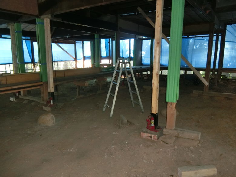 様の古民家再生床の傾き修正工事を施工中です。