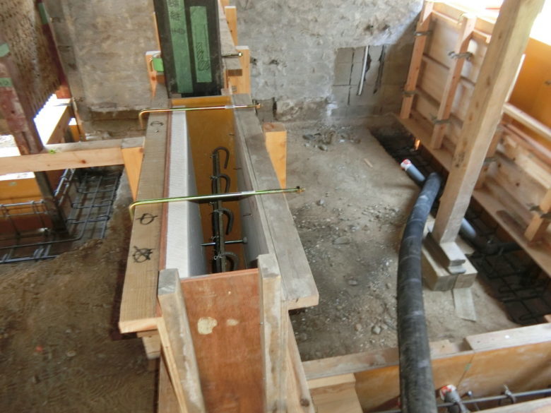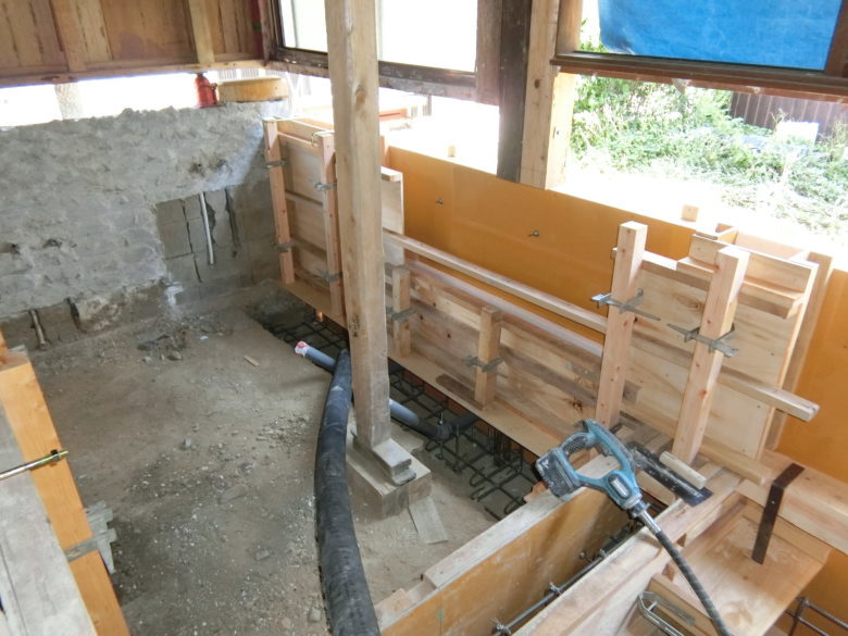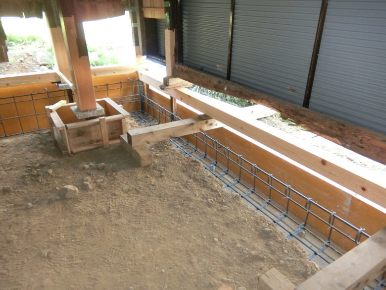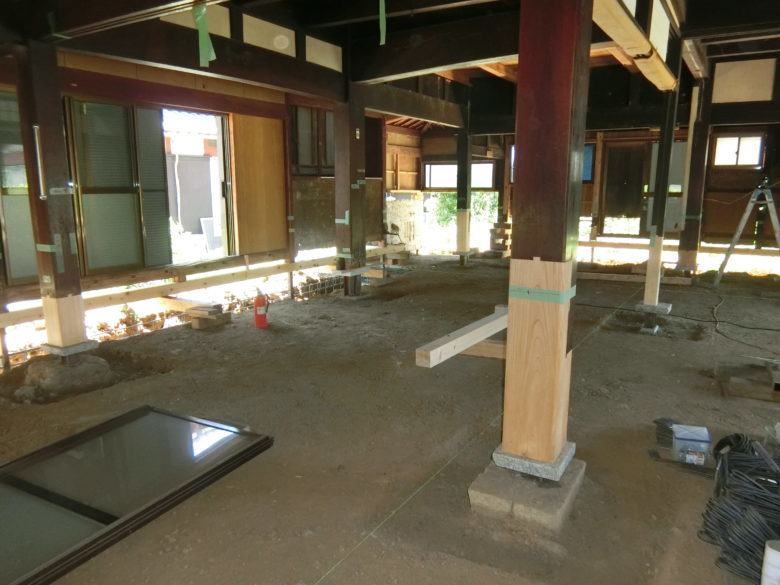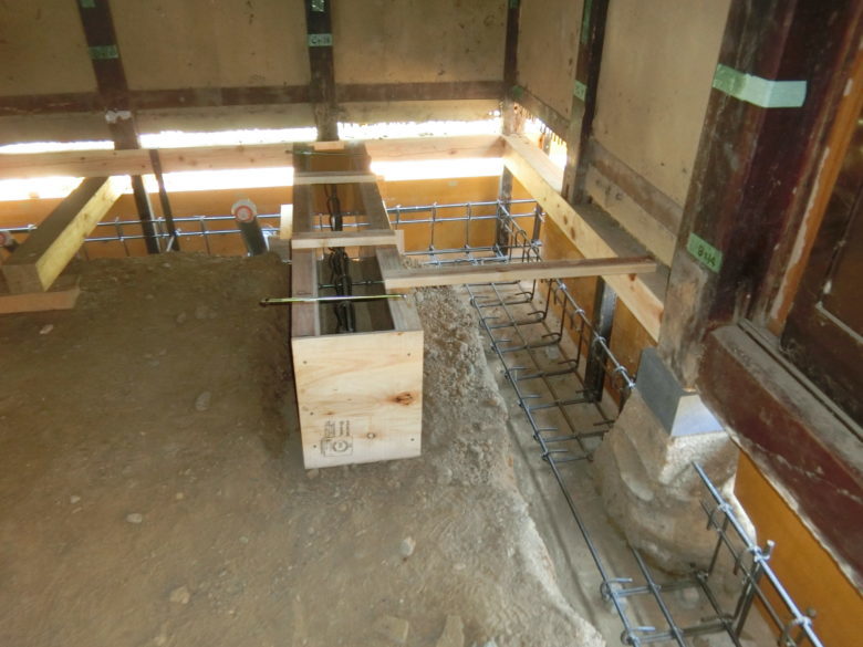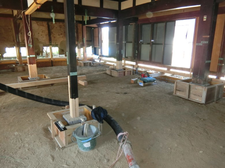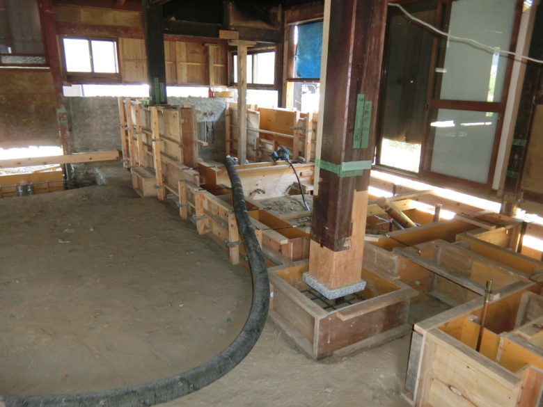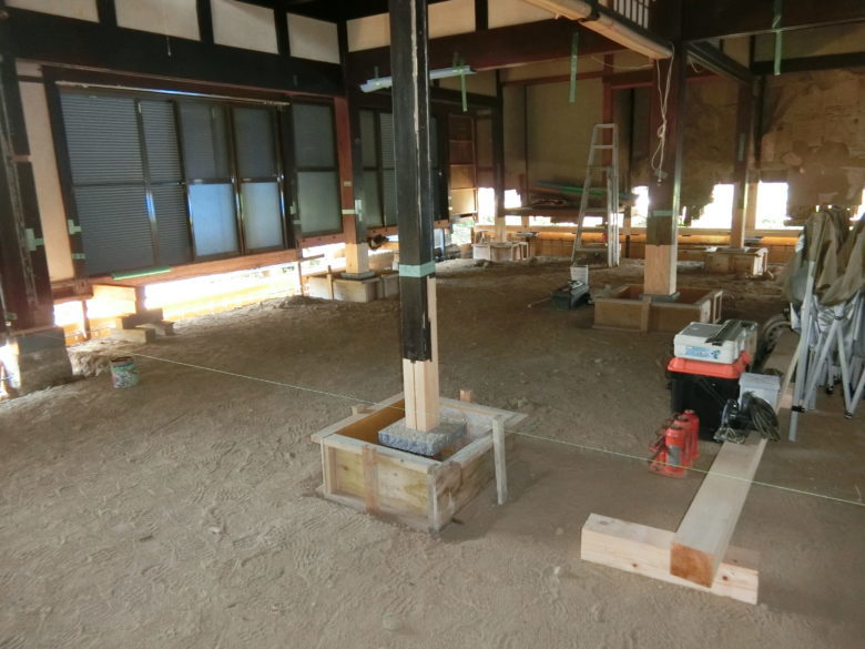 柱の根継ぎも完了し、独立基礎と延石基礎の下地が完成しました。