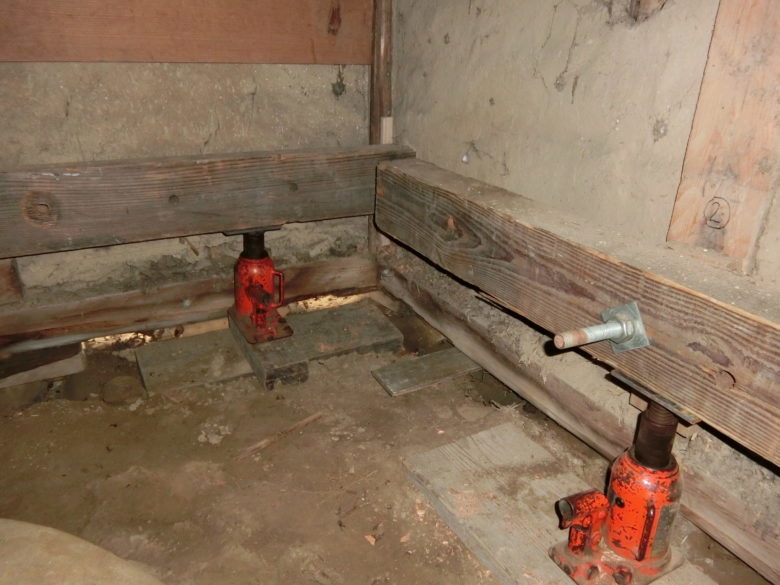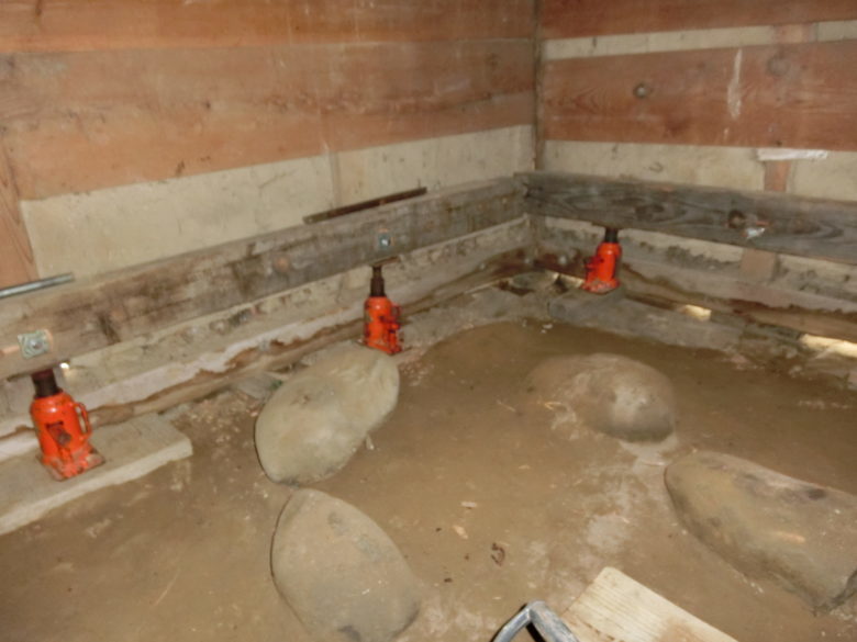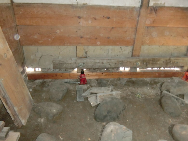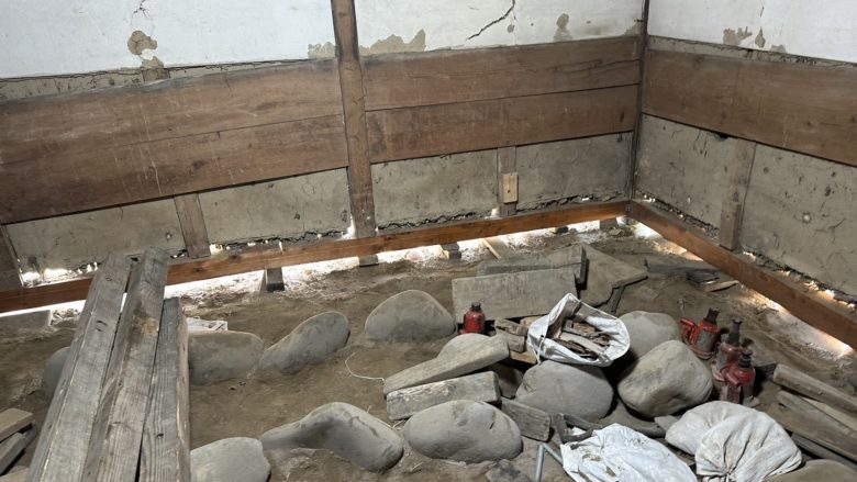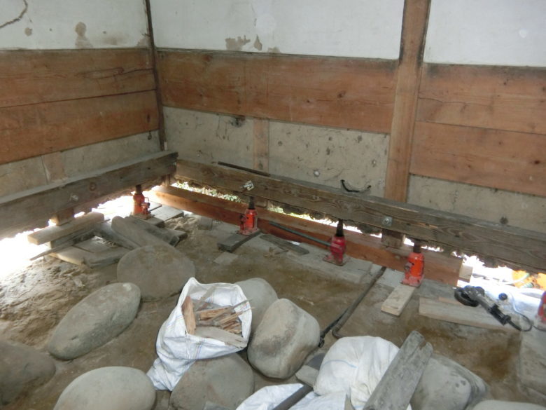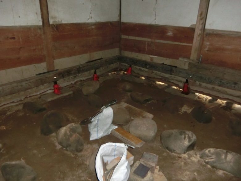 土蔵の傾き修正と土台取替え工事を施工中です。