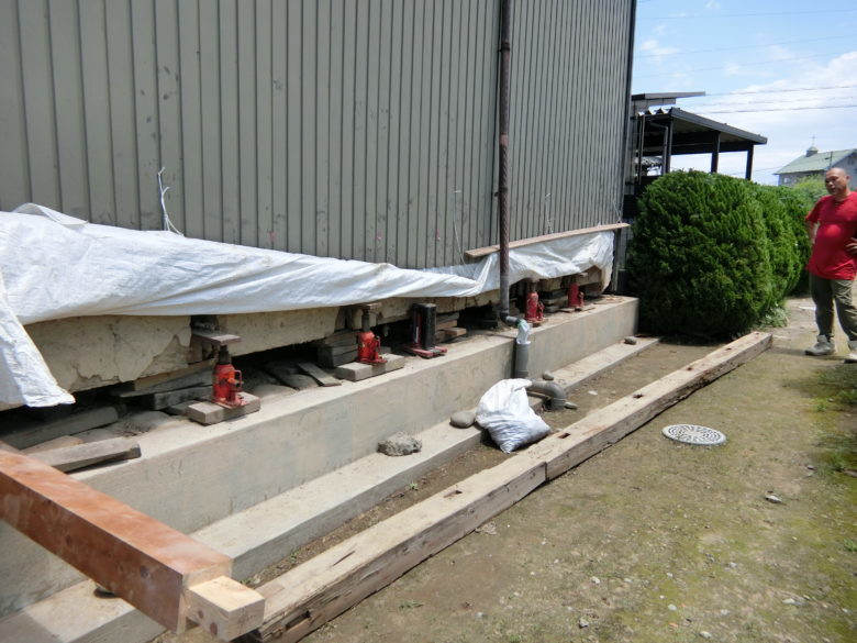 ジャッキセットを行い70㎜ほど揚げ水平にしました。