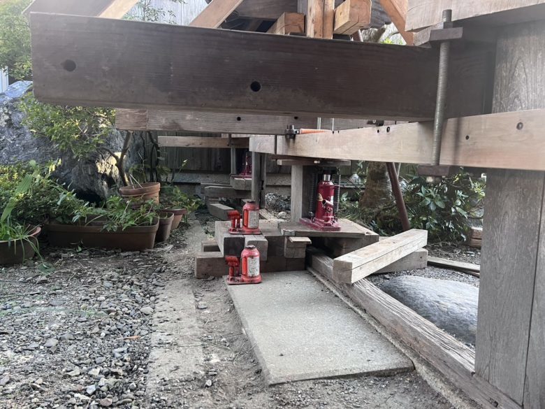嵩上げをします。横架材で根がらみをしてジャッキアップ。