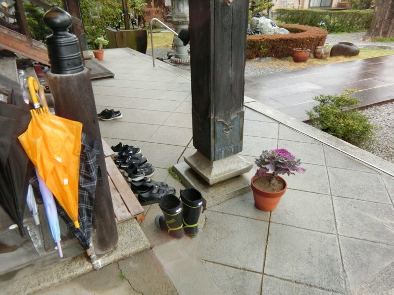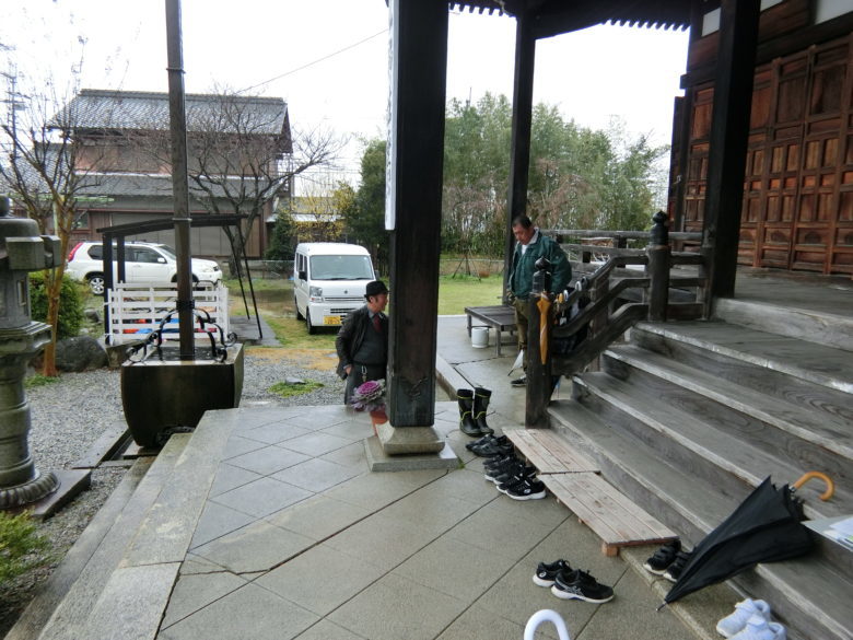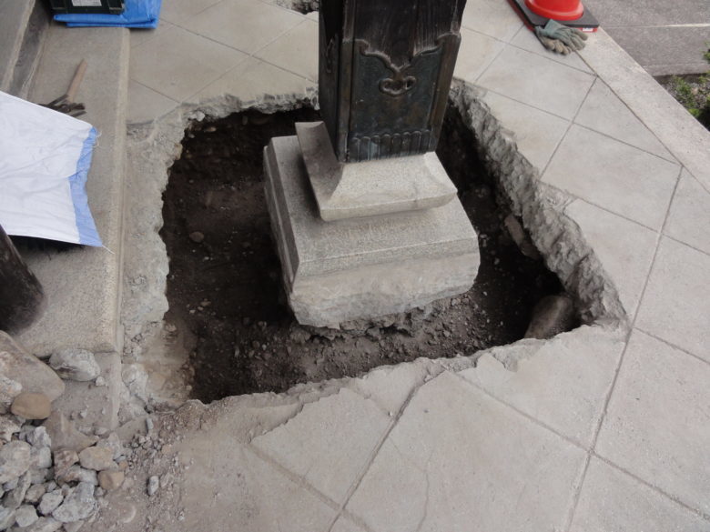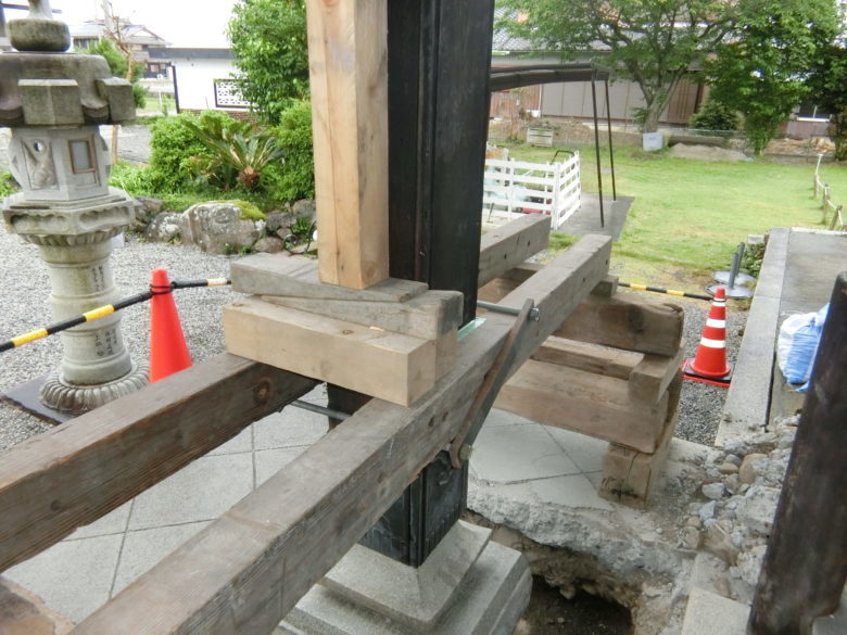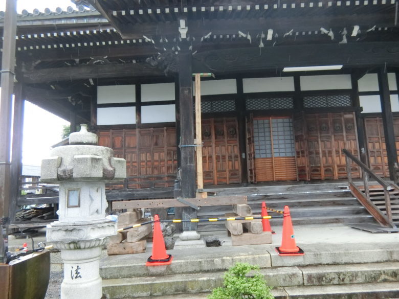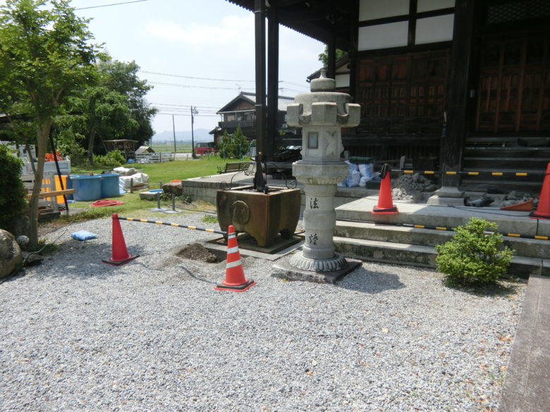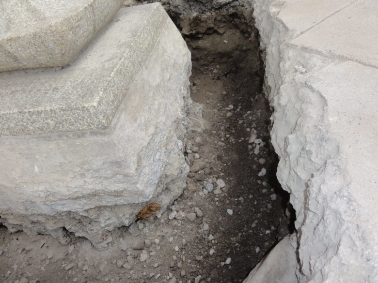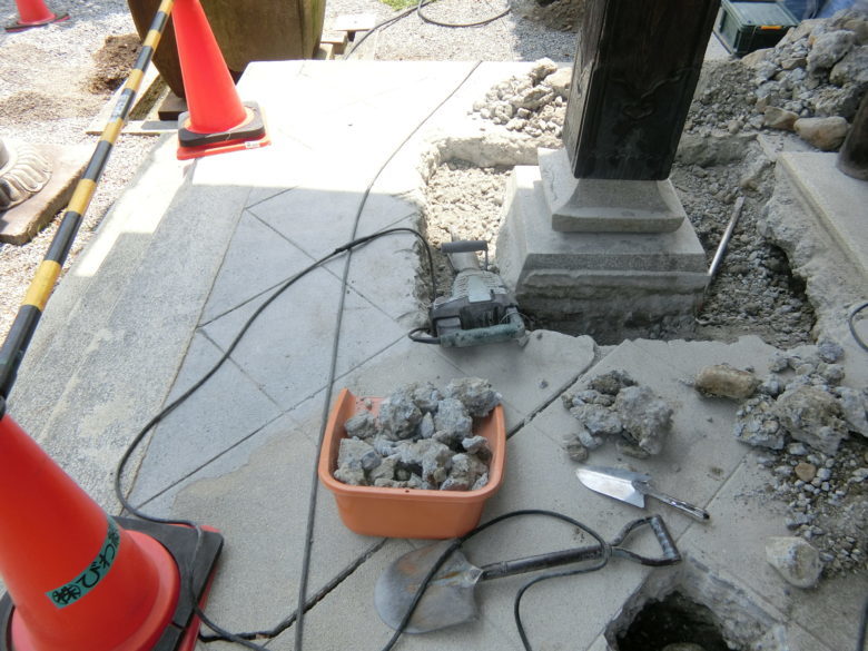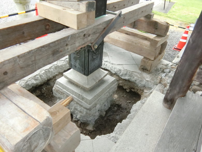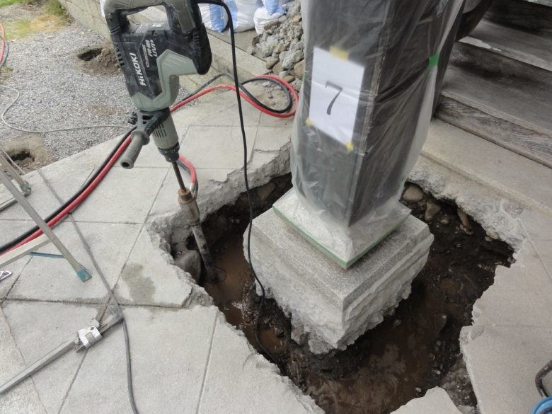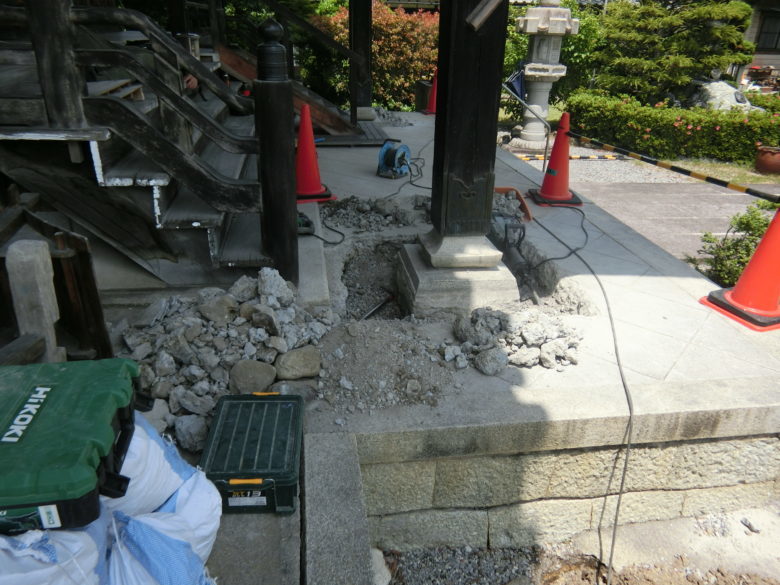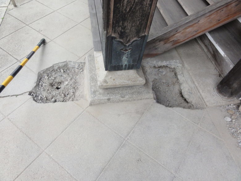 大御堂の向拝柱周辺や手水鉢周辺の沈下が如実に見られ、今後の
