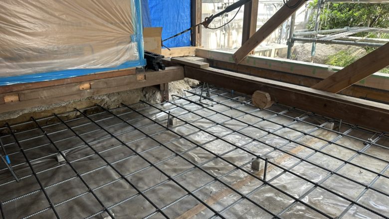 高さは鋼材(□60×60)で調整して土台下には基礎パッキン。