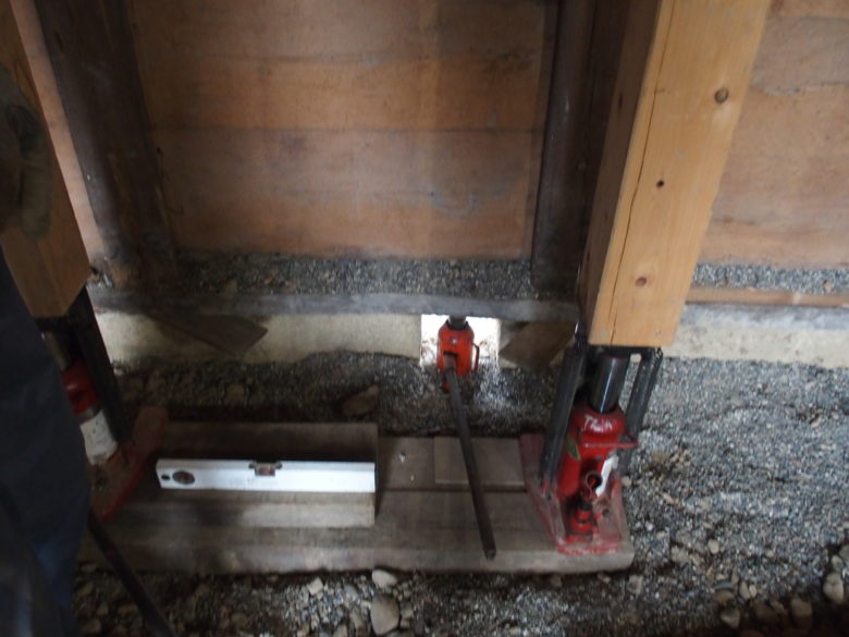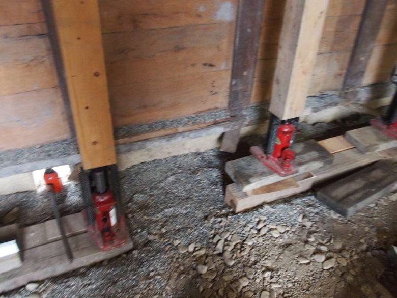 梁に角材を取付けてジャッキセットし沈下した分を調整します。