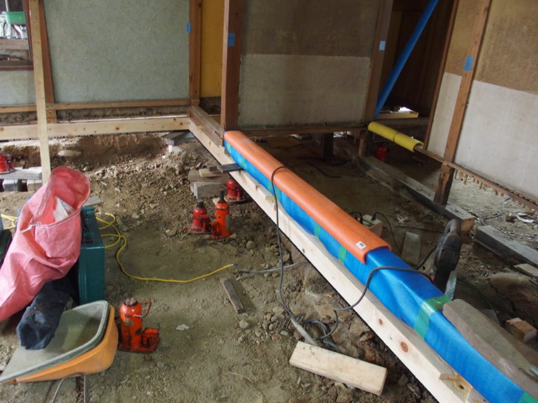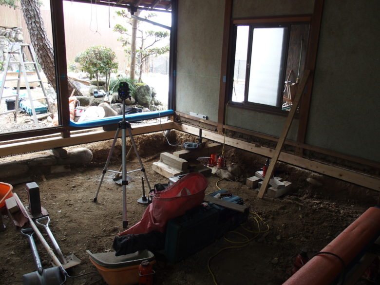 傾き修正を行い、新たなべた基礎を作る為に浮かせてます。
