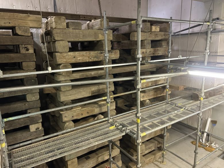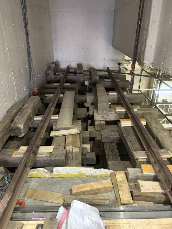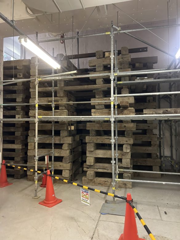 3mを嵩上げする為に枕木を井桁に組み上げ台座になるよう
