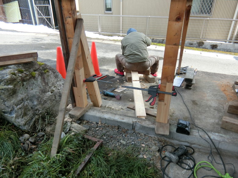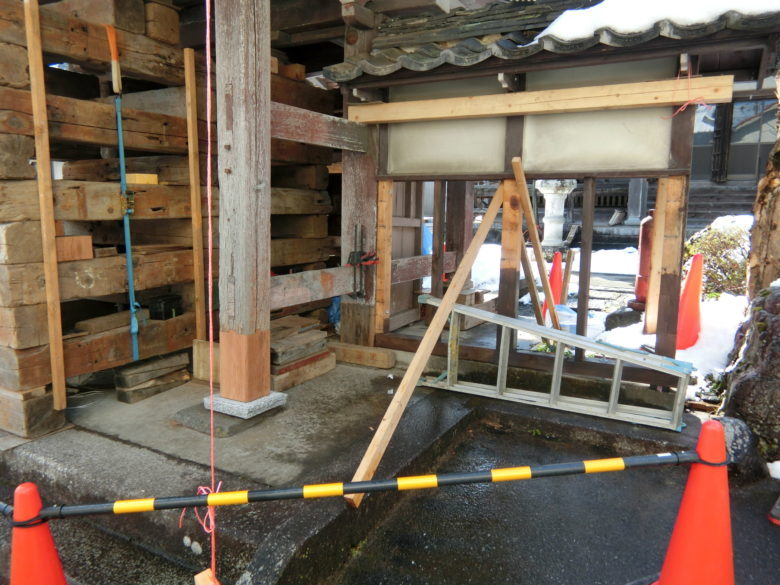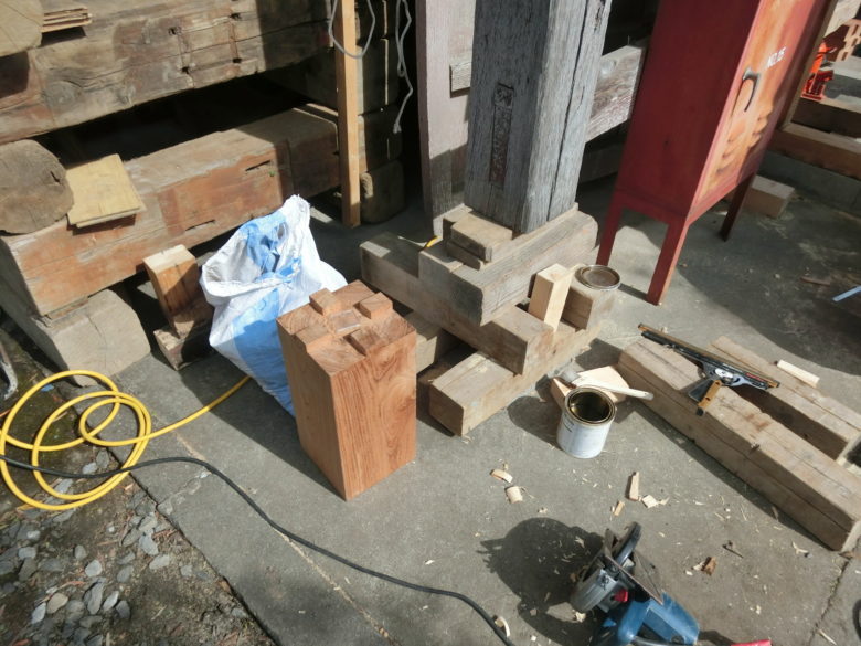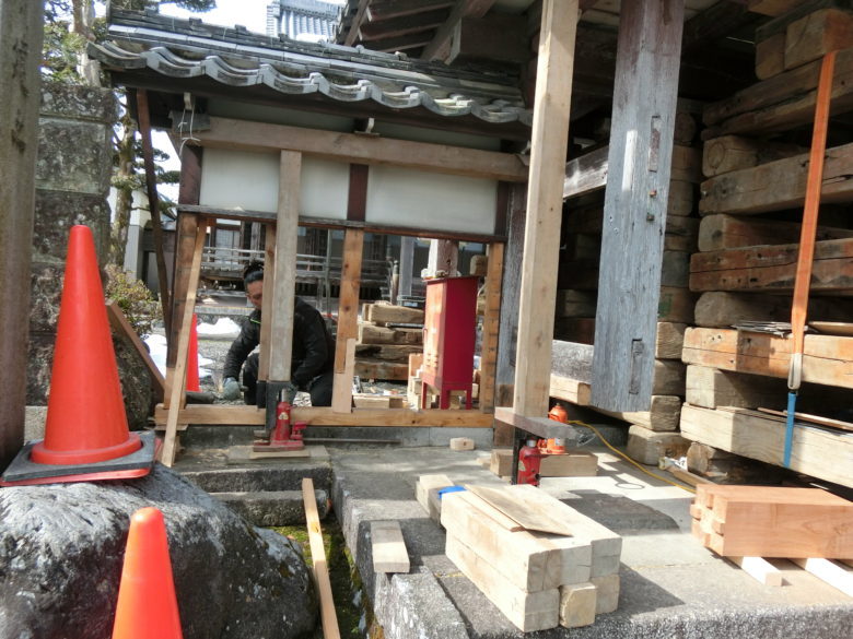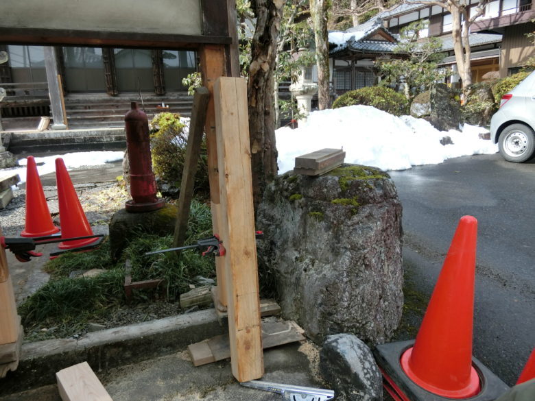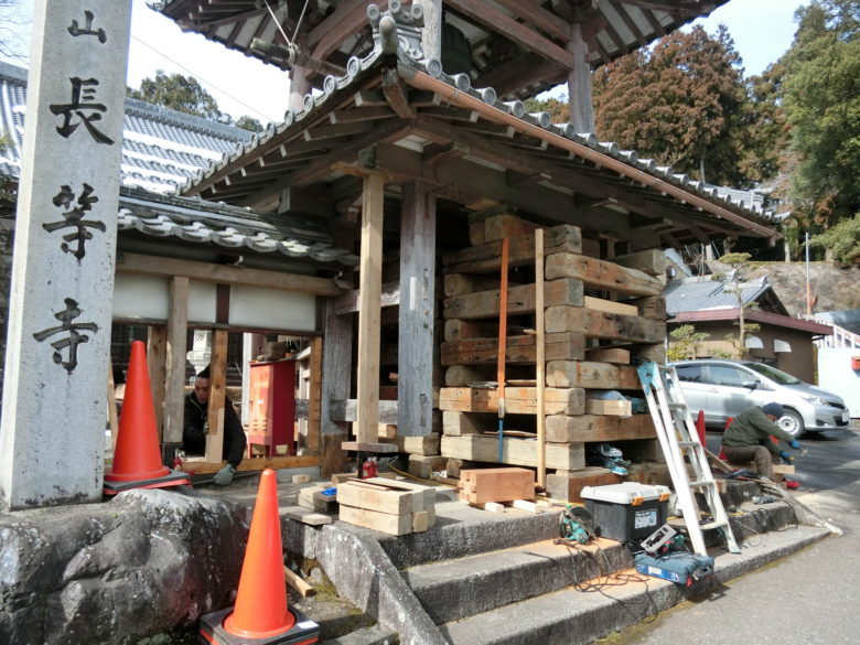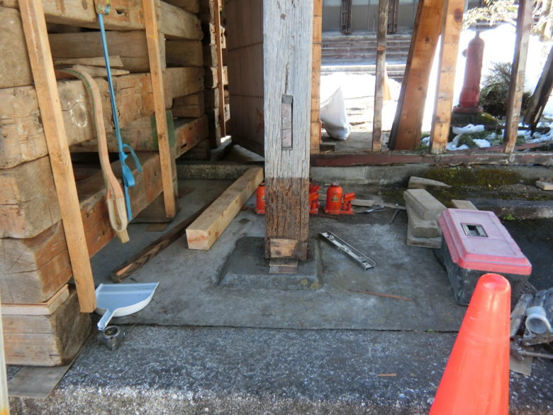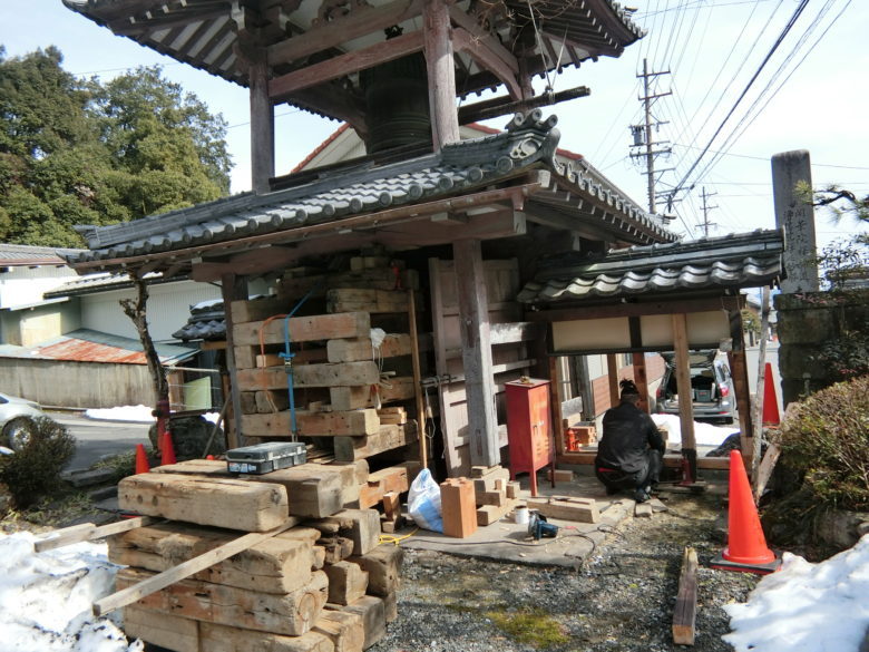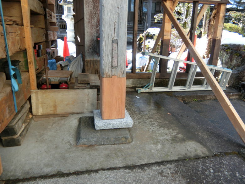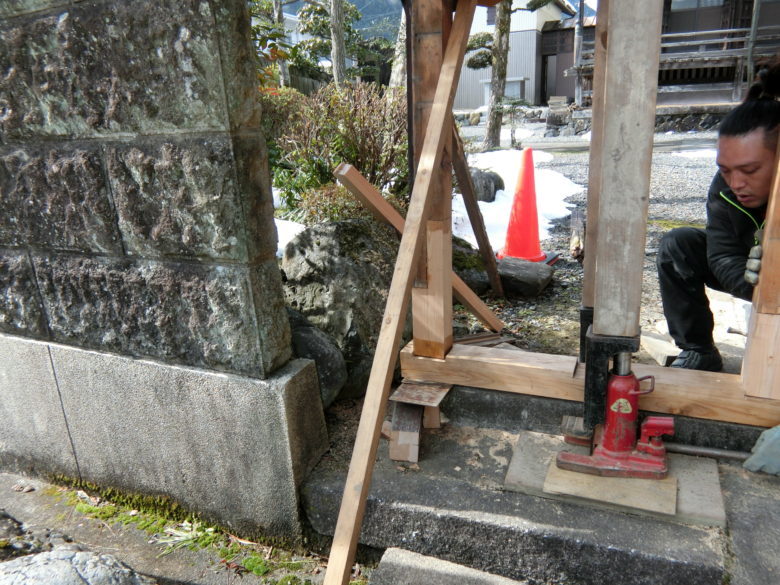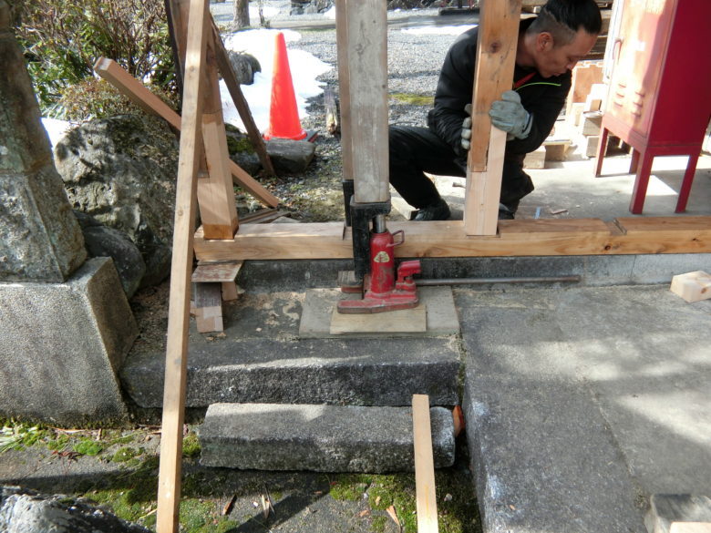 施工事例 曳家 2022.02.19 「柱変われば見た目も変わる!根継ぎの技術!」 本日の現場は揖斐郡揖斐川町の鐘楼門建起し工事です。 腐食した柱脚を切り、目地継ぎという技法で根継ぎ。 社寺建築によくある化粧で、柱周りを腐食しない様に 銅版で囲うのですが逆に腐ってしまうパターンです。 今回その化粧を取外し新たに欅材で根継ぎをします。 昔々は隠したものでしたが、現代は見せる様に。 柱を整え高さを調整して水平にしたら今度は傾きを 直します「建起し」という作業に入ります。 この鐘楼門は袖壁の土台も間柱も腐食がありこの際 いっぺんに交換して全て綺麗な状態に戻します。 今週の一言「建物は!やっぱり足元から!」 腐ったら取り替える。単純ですが王道ですわ!!
