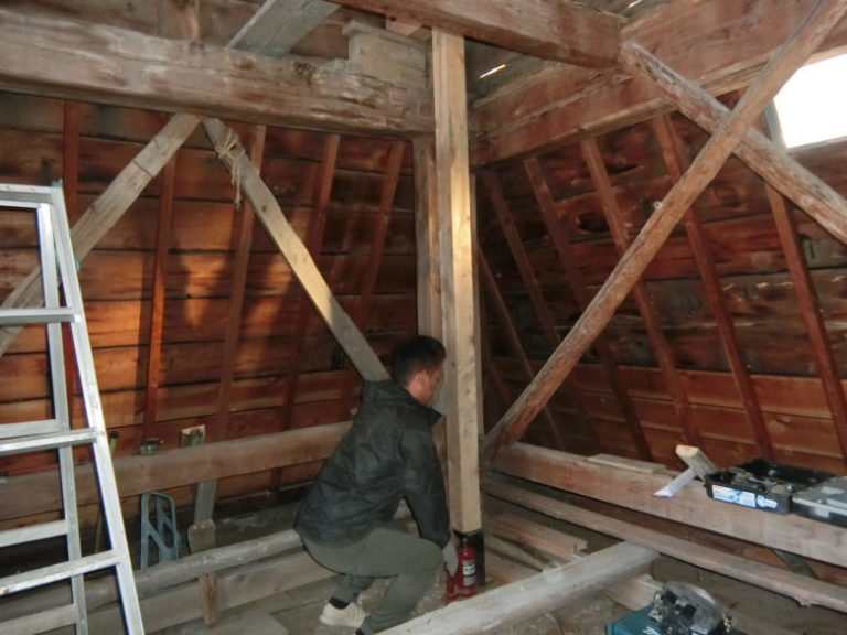 曳家・愛知県豊田市「腐ったものは!取り換える!」 本日はマルス建設株式会社の現場、購入された茅葺古民家の 床組みを解体したら柱の腐食や沈下が…