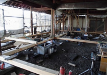 地震によって柱が傾き屋根の根元から柱が折れてしまったので、屋根全体を150㎜上げて新設の柱に入れ替えるという工事です。